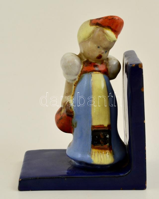 Komlós kislány könyvtámasz, kézzel festett mázas kerámia, jelzett, máz...