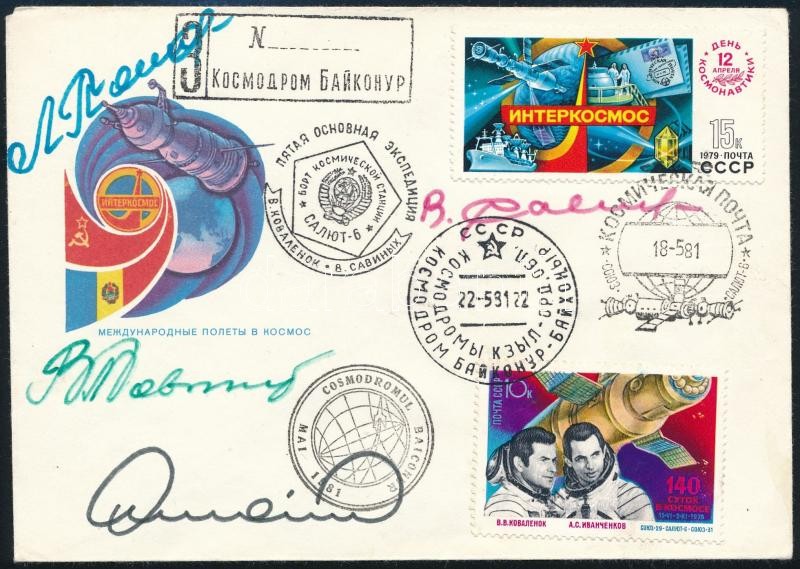 Description: Leonyid Popov (1945- ), Vlagyimir Kovaljonok (1942- ), Viktor Szavinih (1940- ) szovjet és Dumitru Prunariu (1952- ) román űrhajósok aláírásai emlékborítékon /