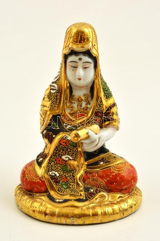 Japán ülő nő porcelán figura, kézzel festett, aranyozott, jelzett, kop...