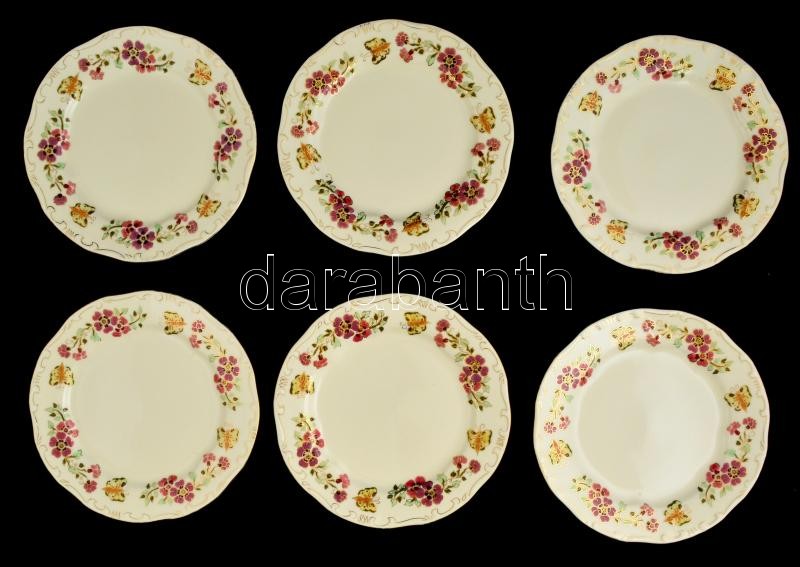 Zsolnay pillangó mintás lapostányér (6 db), jelzett, kézzel festett, kopott, d:24,5 cm (6×)