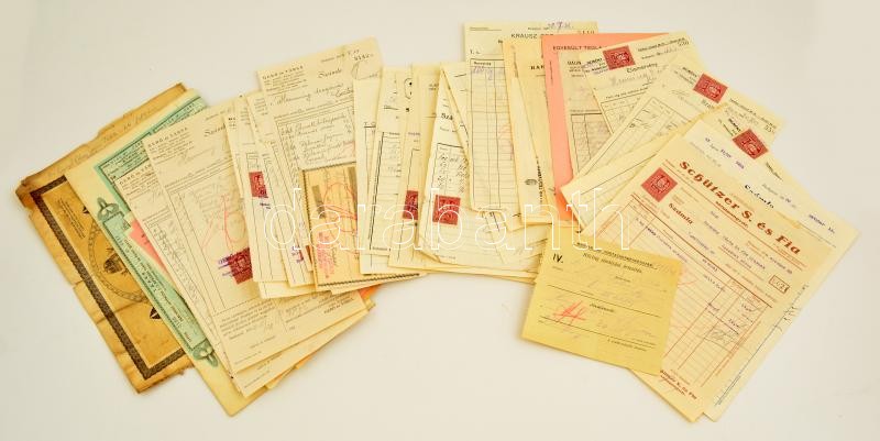 cca 1930 Vegyes számla és részvény tétel, kb. 50 db, okmánybélyegekkel
