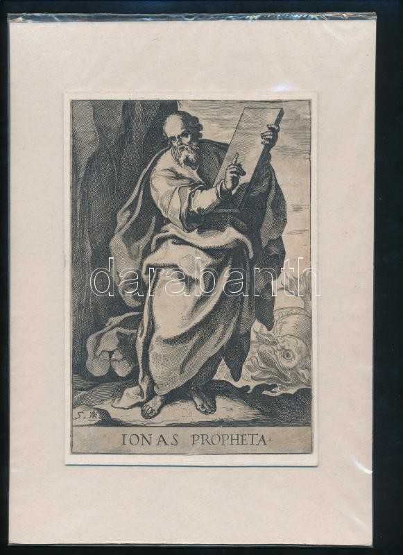 Description: Raffaello Schiaminossi (1572-1622) -Nicolas van Aelst (1527-1613): Ionas Propheta. Jónás rézmetszetű ábrázolása a XII Prophaetarum Imagines... Roma 1609. c. kiadványból. Kartonra ragasztva,Esterházy gyűjtemény szárazpecsétjével, majd Hillinger gyűjteményi bélyegzővel / Original etching on cartboard 13x19 cm