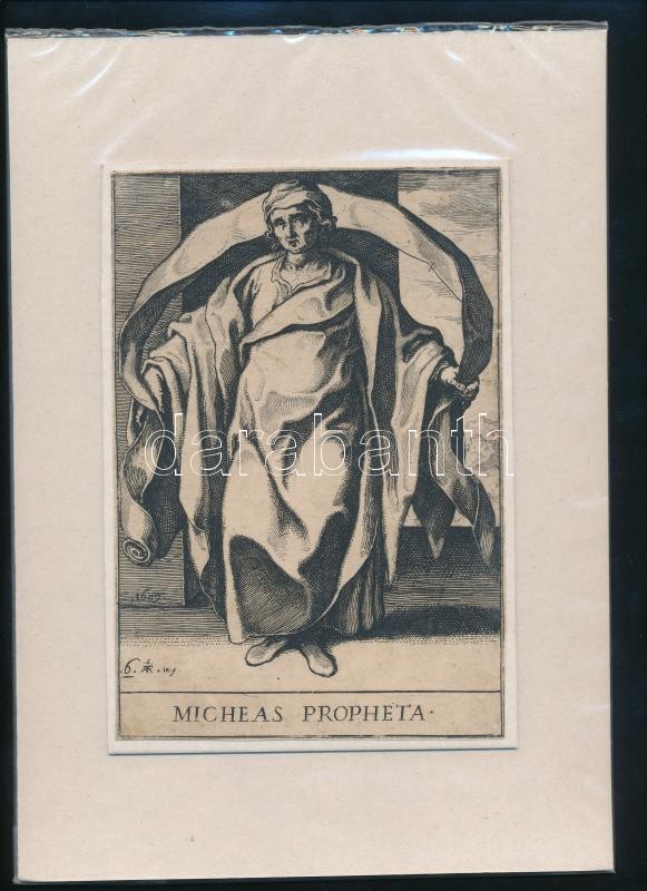 Description: Raffaello Schiaminossi (1572-1622) -Nicolas van Aelst (1527-1613): Micheas Propheta. Mihály rézmetszetű ábrázolása a XII Prophaetarum Imagines... Roma 1609. c. kiadványból. Kartonra ragasztva, Esterházy gyűjtemény szárazpecsétjével, majd Hillinger gyűjteményi bélyegzővel / Original etching on cartboard 13x19 cm