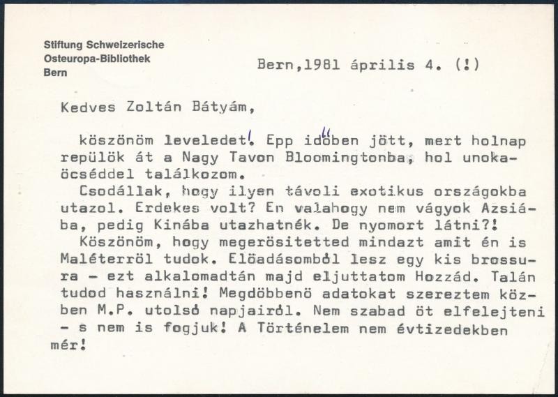 1980 Gosztonyi Péter (1933-1999) történész, újságíró saját kézzel aláírt levele Vas Zoltán gazdaságpolitikusnak, volt 56-os államminiszternek, a levélben érdekes utalások Maléter Pál kivégzett forradalmár ezredesre.