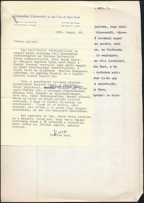 1981 Charles Gati (1934-) amerikai szenátor saját kézzel aláírt levele Vas Zoltán (1903-1983) író, 56-os államminiszter részére, melyben Vas Magyarországon kiadni nem engedett könyvének amerikai kiadási lehetőségeiről egyeztetnek. Hozzá Vas géppel írt válasza.