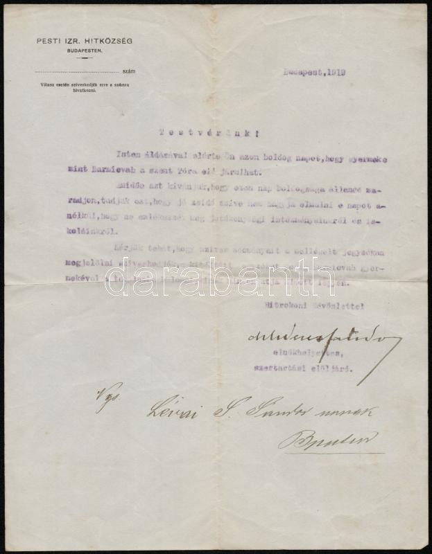 1919 A pesti izr. hitkközség elnökhelyettesének aláírt levele.