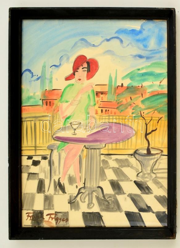 Frank jelzéssel: Kalapos hölgy az asztalnál. Akvarell, papír, üvegezet...