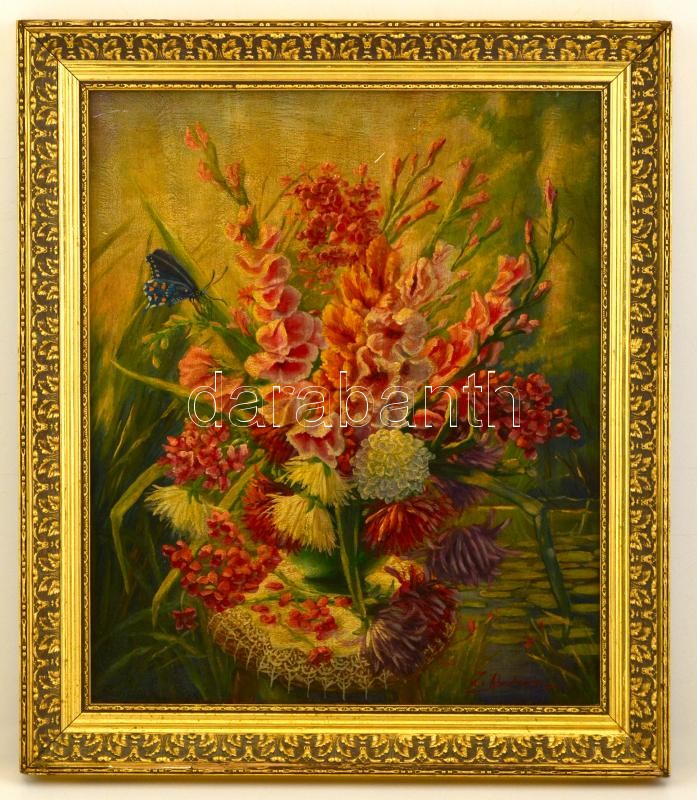 Olvashatatlan jelzéssel: Virágcsendélet. Olaj, falemez, keretben, 60×5...