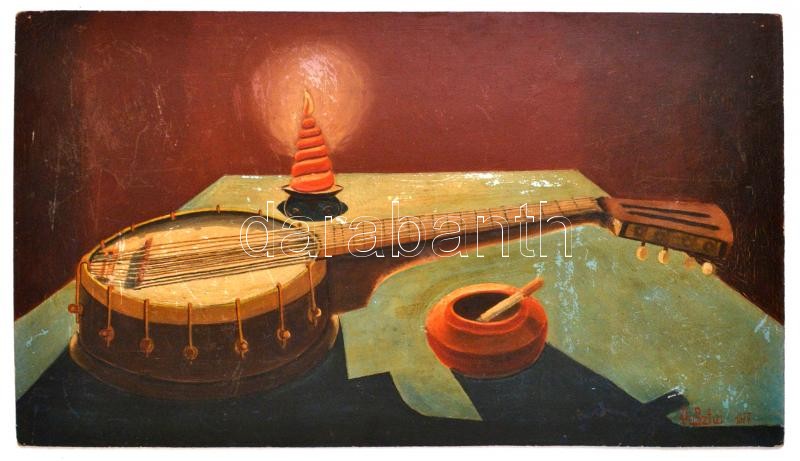 Pusztai jelzéssel: Asztali csendélet bendzsóval. Olaj, farost, 30×53 c...
