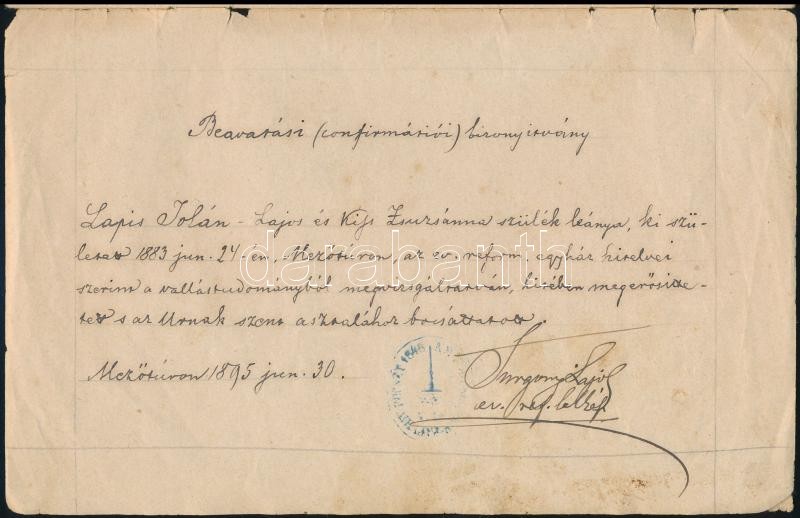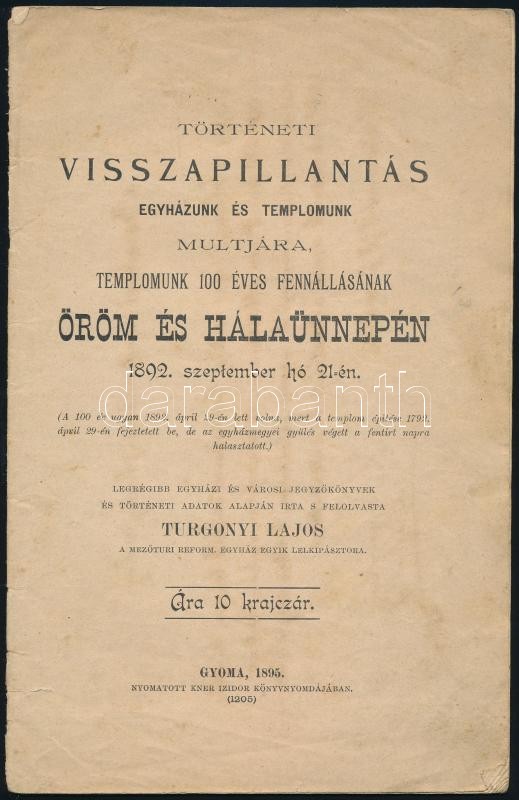1895 Turgonyi Lajos: Történeti Visszapillantás egyházunk és templomunk multjára, templomunk 100 éves fennállásának öröm és hálaünnepén 1892. szeptember hó 21.-én. Gyoma, 1895, Kner Izidor. Papírkötés, a címoldal hátoldalán konfirmációs bizonyítvány, pecséttel, aláírással, 28 p. Az utolsó oldal szakadt, kissé hiányos. Turgonyi Lajos (1838-1907) mezőtúri református lelkész, politikus.