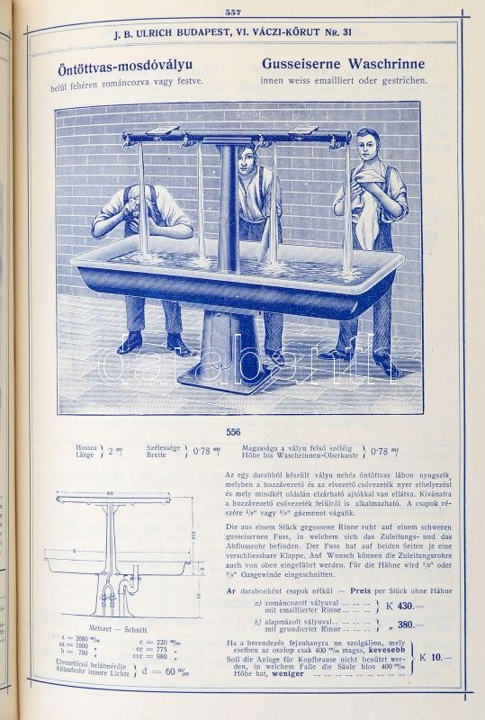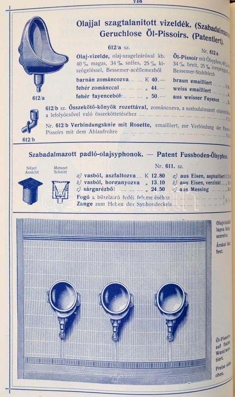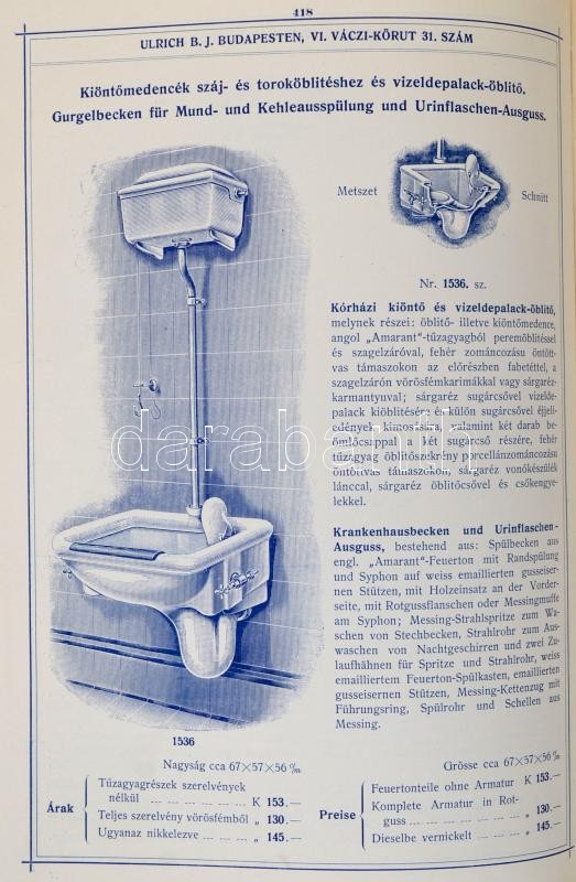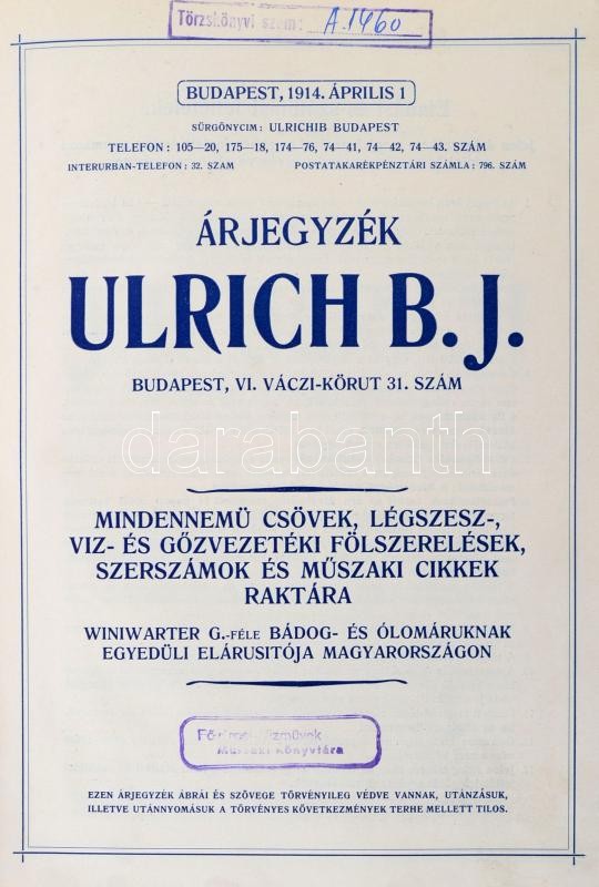 1914 Ulrich B. J. Árjegyzéke. Budapest, 1914. április 1. Mindennemű csövek, légszesz-, víz- és gőzvezetéki fölszerelések, szerszámok és gyári technikai eszközök raktára. Winiwarter G.-féle bádog- és ólomáruknak egyedüli elárusítója Magyarországon. Bp., Ulrich B.J., 1360 p. Kiadói aranyozott egészvászon-kötésben, sérült gerinccel, de belül jó állapotban, volt könyvtári példány, gazdag egészoldalas és szövegközti illusztrációkkal, magyar és német nyelven.