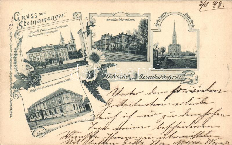 1898 Szombathely, Püspöki palota, székesegyház, árvaház, evangélikus templom, polgári és felső kereskedelmi iskola, kiadja Gabriel Ágoston / bishop's palace, churches, orphanage, school