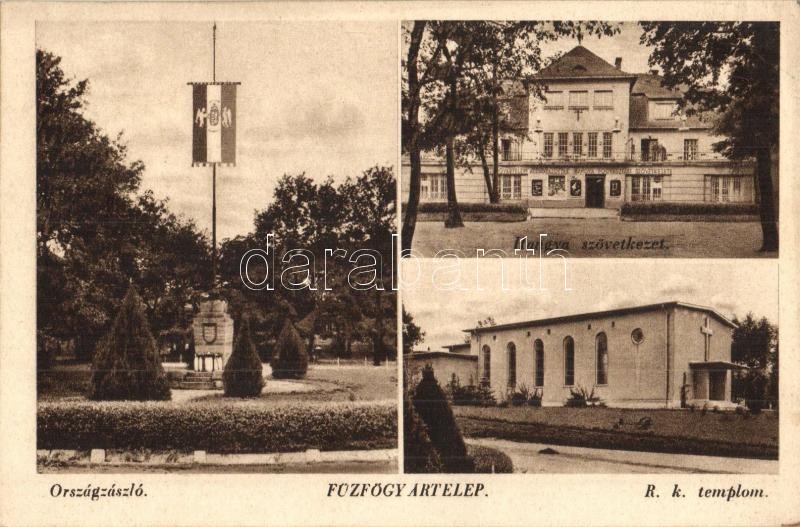 Balatonfűzfő, Fűzfőgyártelep, Hangya fogyasztási szövetkezet, Országzászló, Római katolikus templom (EK)