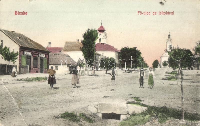 Bicske, Fő utca, iskola, templomok, Kun Gábor üzlete és saját kiadása ...