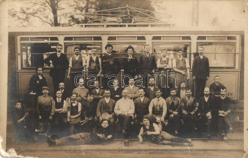 Budapest, HÉV (Helyiérdekű vasút) kocsi, vasutasok és munkások alkatrészekkel. photo (kis szakadás / small tear)