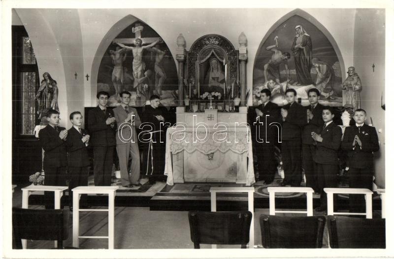 Budapest II. Golgotai kápolna kálvária oltára a Szent Antal árvaház fiaival, belső. Hidegkúti út 117.