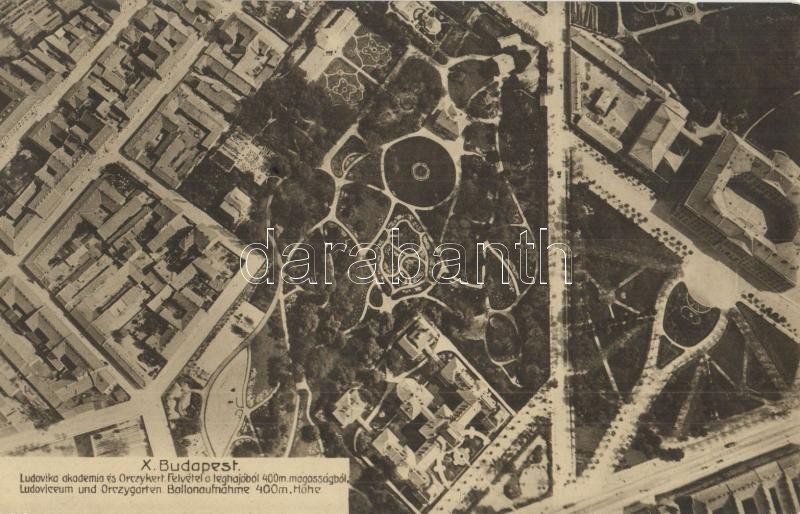 Description: Budapest VIII. Ludovika akadémia és Orczy kert. Kral Sándor tüzérkapitány, a magyar aero-klub kapitányának felvétele léghajóból 400 m magasságból / aerial view from airship