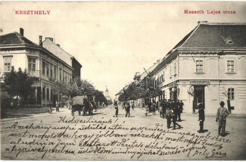 Keszthely, Kossuth Lajos utca, gyógyszertár, Korona szálloda. S. D. M....