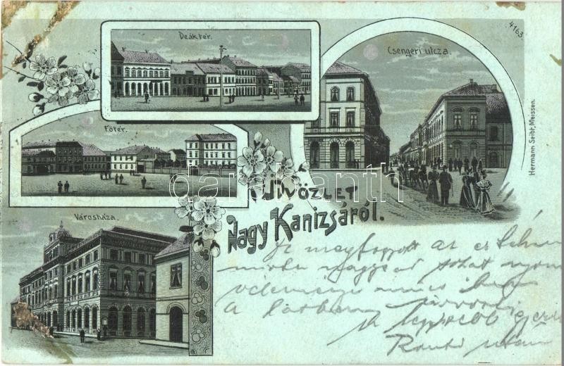 Nagykanizsa, Csengeri utca, Deák és Fő tér, Városháza. Hermann Seibt 4163. ezüstös floral, Art Nouveau, litho (vágott / cut)