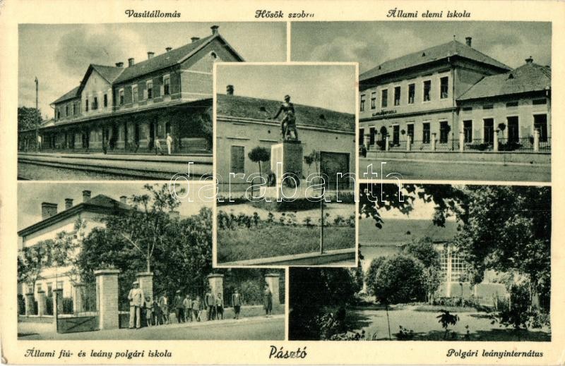 Pásztó, vasútállomás, Hősök szobra, Állami elemi iskola, Állami fiú és leány polgári iskola, Polgári leányinternátus