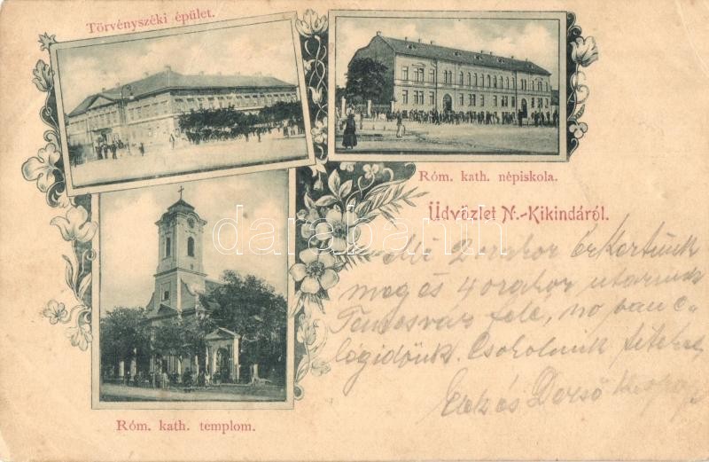 Description: Nagykikinda, Kikinda; Törvényszéki épület, Római katolikus templom és népiskola / Roman Catholic church and school, Criminal Tribunal. Art Nouveau, floral (fa)