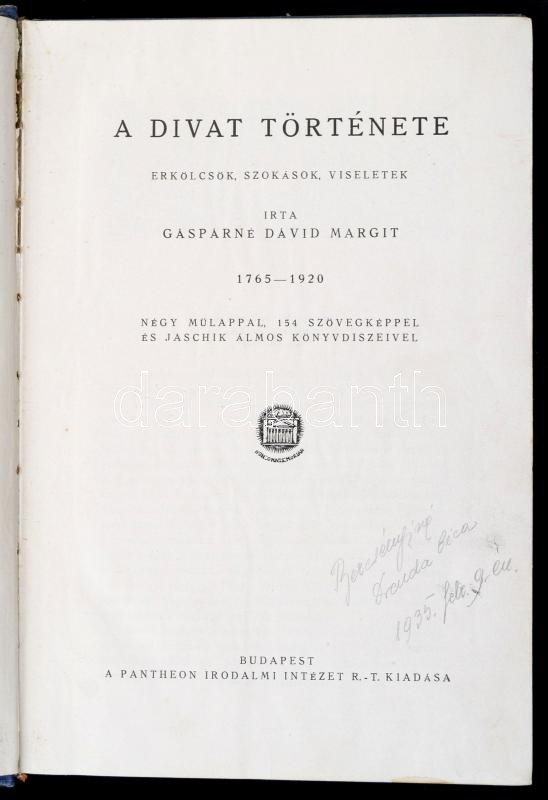 Description: Gáspárné Dávid Margit: A divat története. Erkölcsök, szokások, viseletek. 1765-1920. Bp.,1923,Pantheon, 254 p. Gazdag fekete-fehér szövegközti és egészoldalas illusztrációkkal. Jaschik Álmos könyvdíszeivel. Kiadói aranyozott egészvászon-kötésben, sérült gerinccel, a három színes melléklet és a címkép hiányzik.