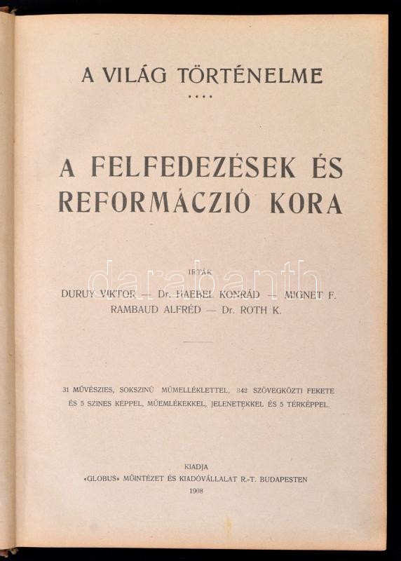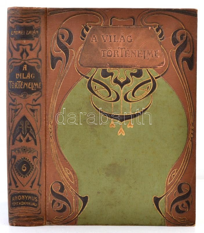 Description: A felfedezések és a reformáció kora. A világ történelme 6. kötet. Szerk.: Endrei Zalán. Bp., 1908, Globus. Kiadói szecessziós egészvászon-kötés, kissé kopottas, foltos borítóval, az elülső kötéstáblánál a kötés kissé sérült, de belül jó állapotban.