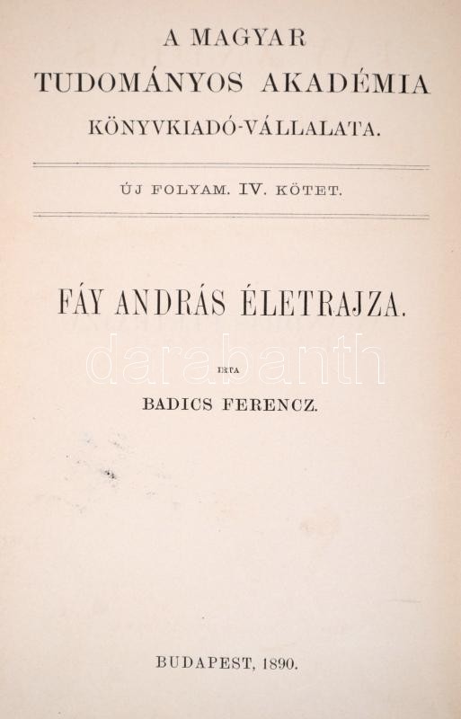 Bp. 1890. MTA. 1 t. (Fáy András acélmetszetű portréja). Kiadói, kissé laza egészvászon kötésben, márványozott lapszéllel.