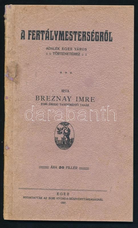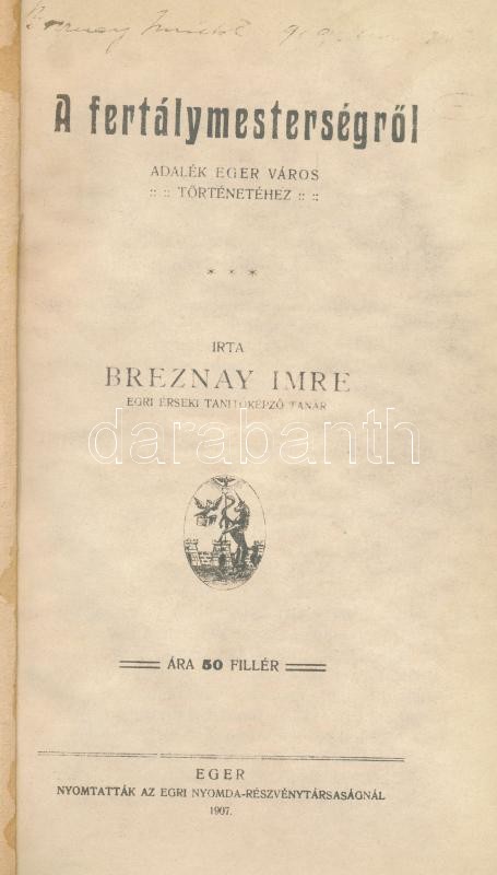 Breznay Imre: Az egri fertálymesterségről. Adalék Eger város történetéhez. Eger, 1907, Egri-Nyomda Rt., 56 p. Papírkötésben, az első 19 oldal pótolt, az eredeti borítót rákasírozták az új borítóra.