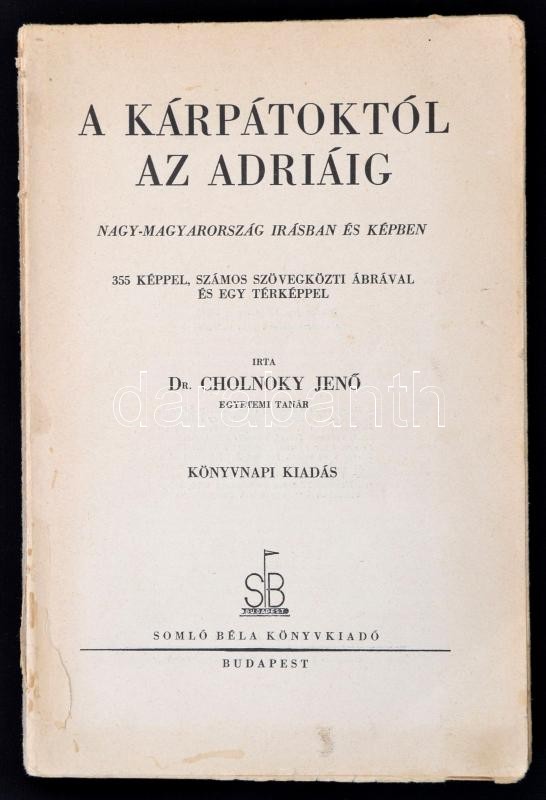 Dr. Cholnoky Jenő: A Kárpátoktól az Adriáig. Bp., 1934, Somló Béla, 275 p. Fűzött papírkötésben, hiányzó borítóval, kissé laza fűzéssel.