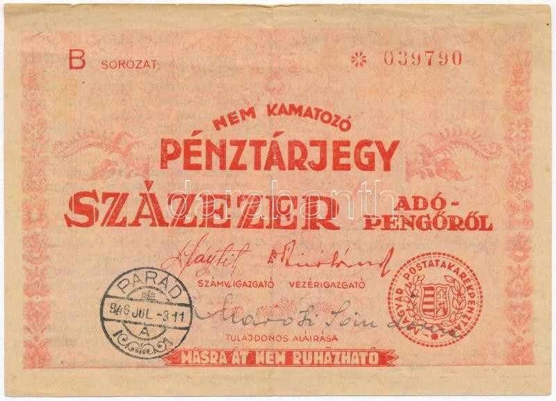 1946. 100.000AP nem kamatozó Pénztárjegy "Másra Át Nem Ruházható", "PARÁD" felülbélyegzéssel T:II-,III