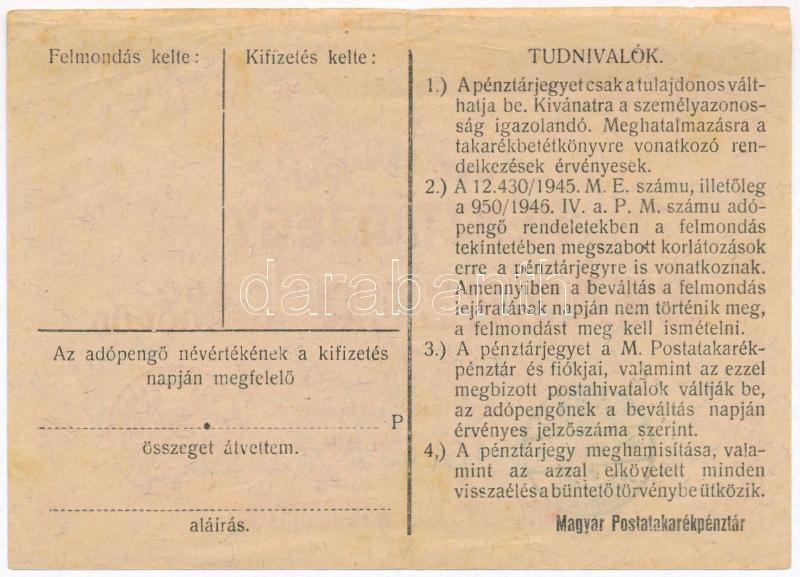 1946. 100.000AP nem kamatozó Pénztárjegy "Másra Át Nem Ruházható&...