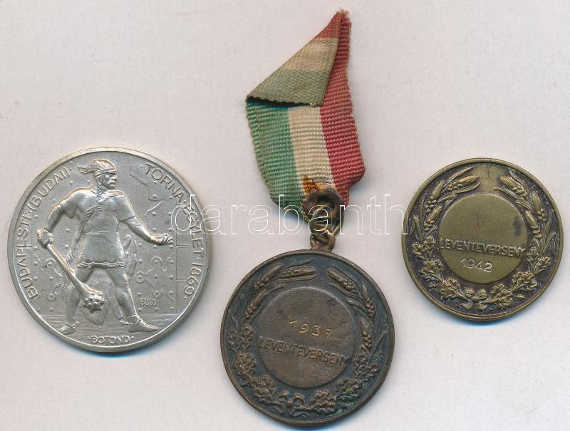 Berán Lajos (1882-1943) 1934. "Budapesti (Budai) Torna Egylet 1869 - Botond / Bély-Demény csapatverseny II. díj 1934" ezüstözött Br díjérem (40mm) + 1937. "Leventeverseny 1937" Br díjérem nemzetiszín szalaggal (34mm) + 1942. "Leventeverseny 1942" fém díjérem (32mm) T:2