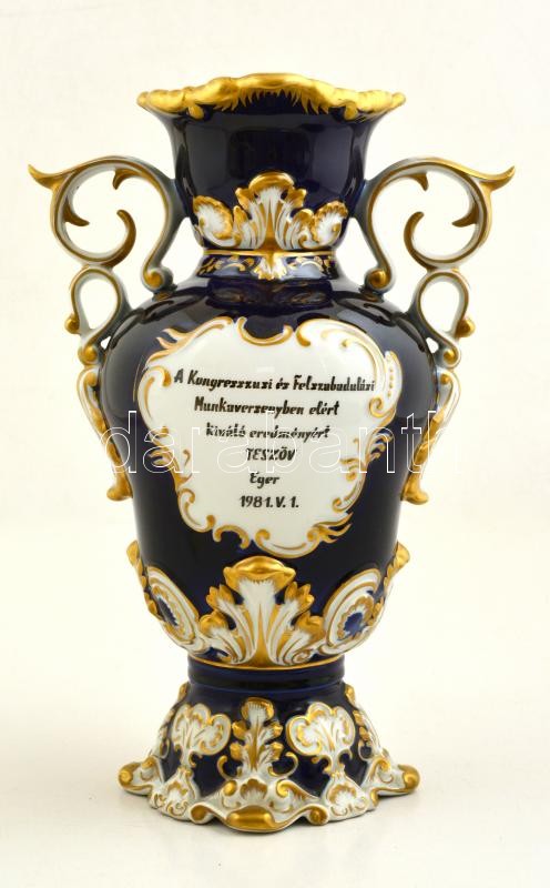 Description: Hollóházi díszváza, "A Kongresszusi és Felszabadulási Munkaversenyben elért kiváló eredményért Teszöv Eger" felirattal, kézzel festett, jelzett, hibátlan, m: 34 cm