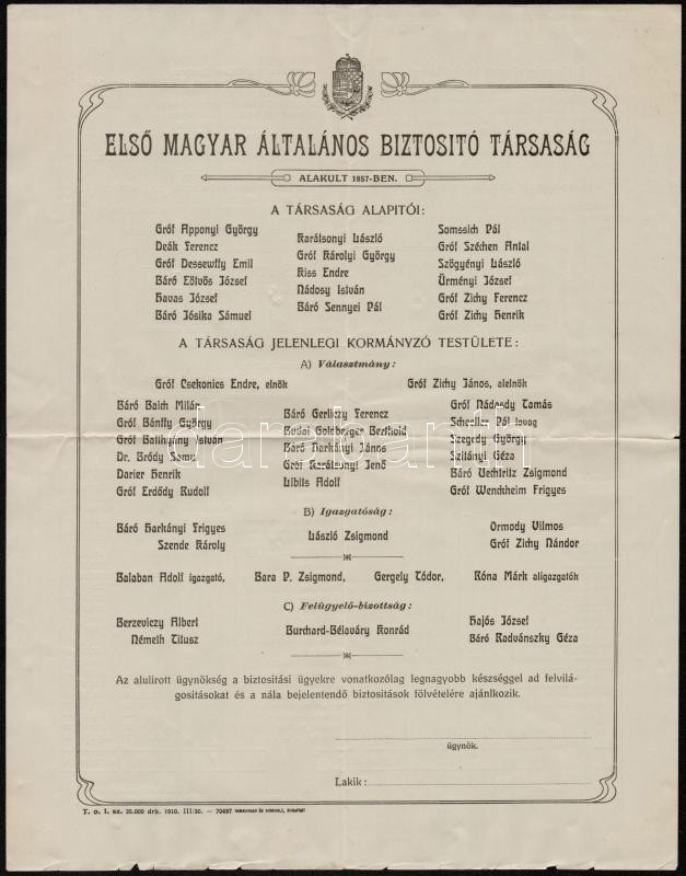 1910 az Első Magyar Általános Biztosító Társaság kötvénye Gyenes Józse... https://www.darabanth.com/en/308-Online-auction/308.0/Other-collectibles/Documents~16/1910-az-Elso-Magyar-Altalanos-Biztosito-Tarsasag-kotvenye-Gyenes-Jozsef-1864-1929-torvC3~II1672123