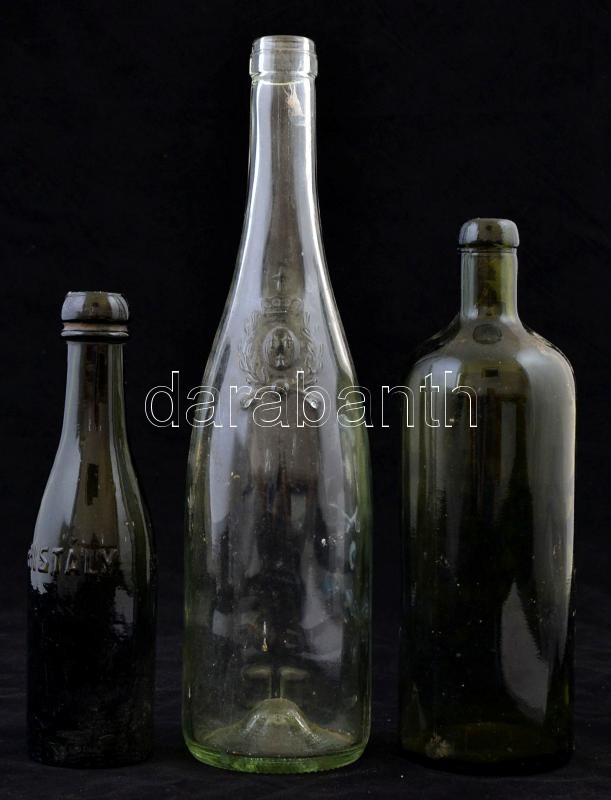 3 db feliratos vizes üveg (Ferenc József keserűvíz, stb.), kopásokkal, apró csorbákkal, m: 20-31 cm