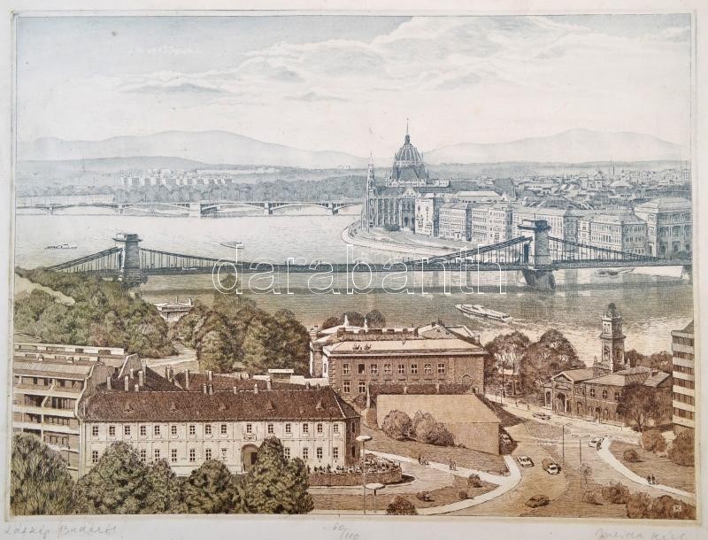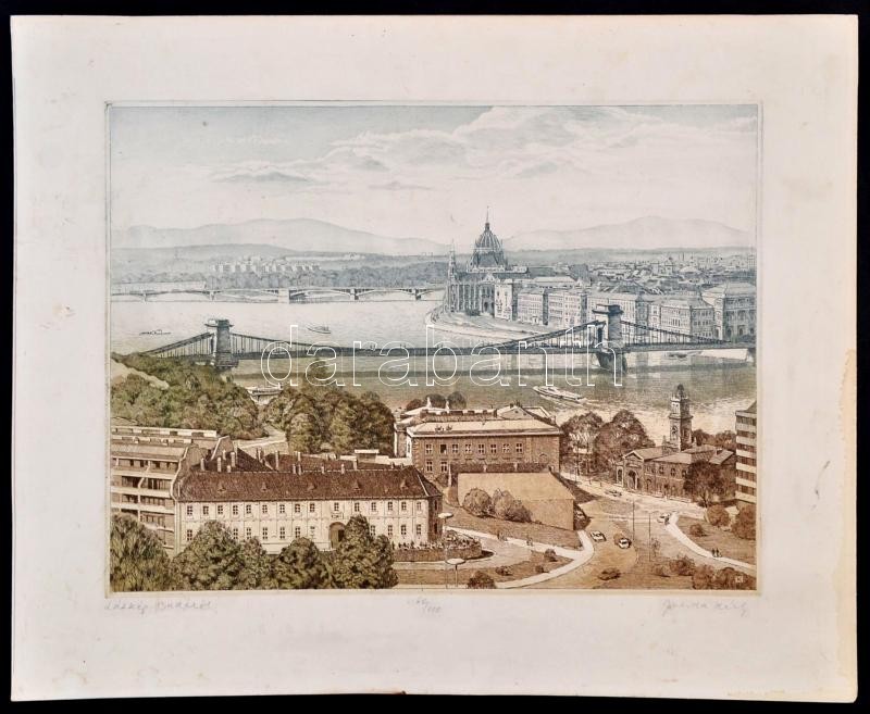 Jurida Károly (1935-2009): Látkép Budáról, színezett rézkarc, papír, j...