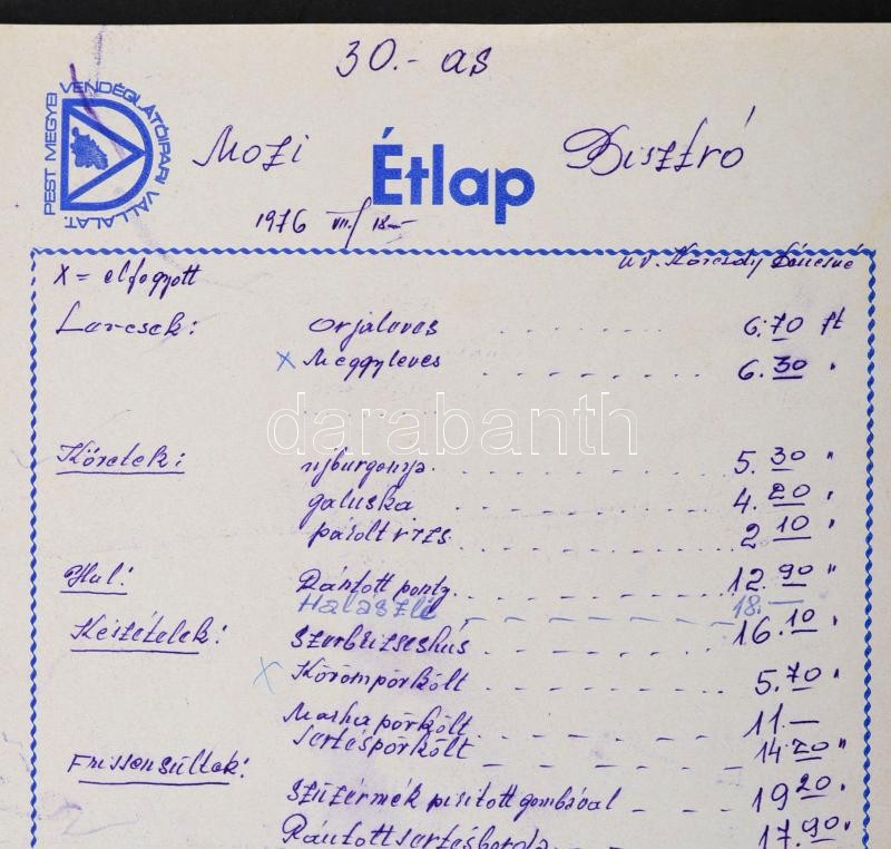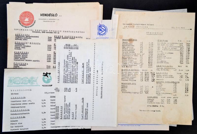 1969-1979 7 db különböző étlap, többek közt: Pest Megyei Vendéglátóipari Vállalat, Utasellátó, Márványmenyasszony, Halásztanya