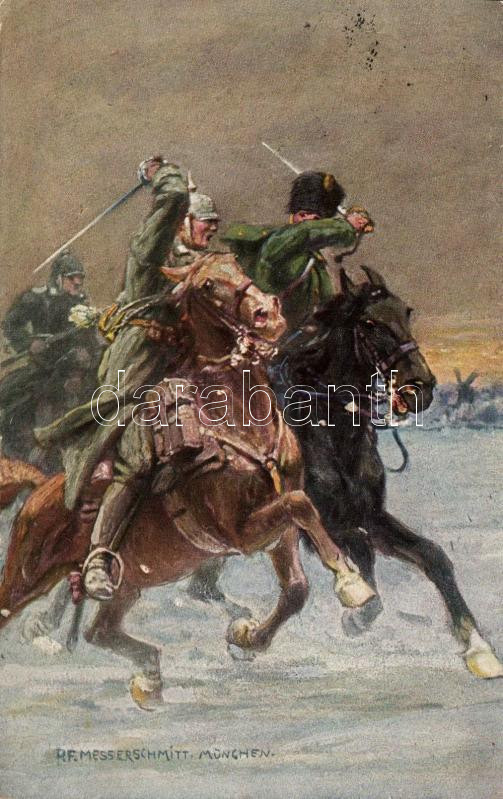 German cavalary against Russian cavalary in battle, Münchener Künstlerkarte No. 8, s: RF. Messerschmitt