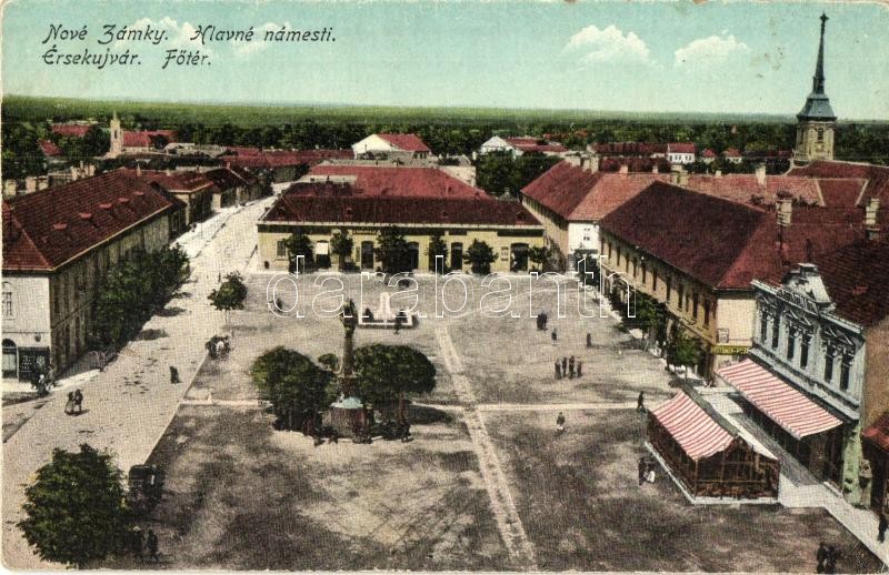 Érsekújvár, Nové Zamky; Hlavné námesti / Fő tér, üzletek, Járásbíróság...