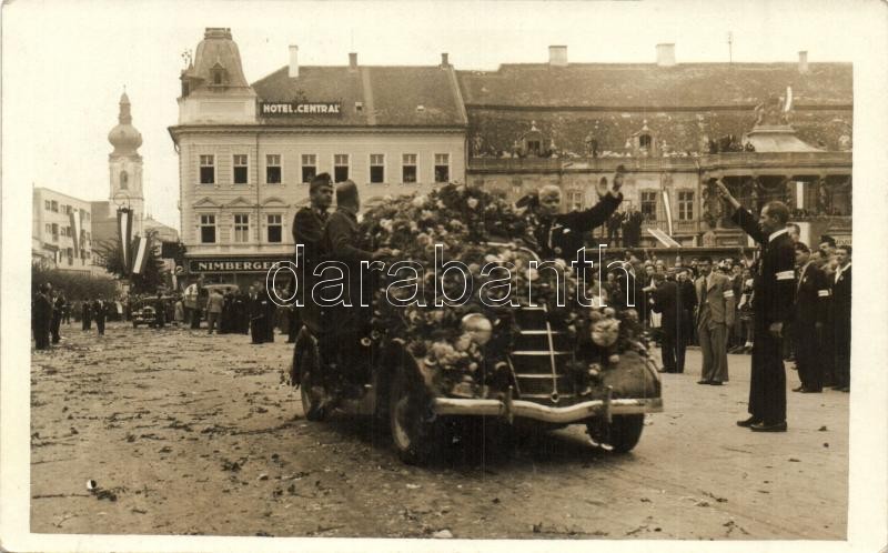 1940 Kolozsvár, Cluj; bevonulás, automobil, Hotel Central szálloda, Nimberger üzlete / entry of the Hungarian troops, automobile, hotel, shops. Cservény photo + Kolozsvár visszatért So. Stpl.