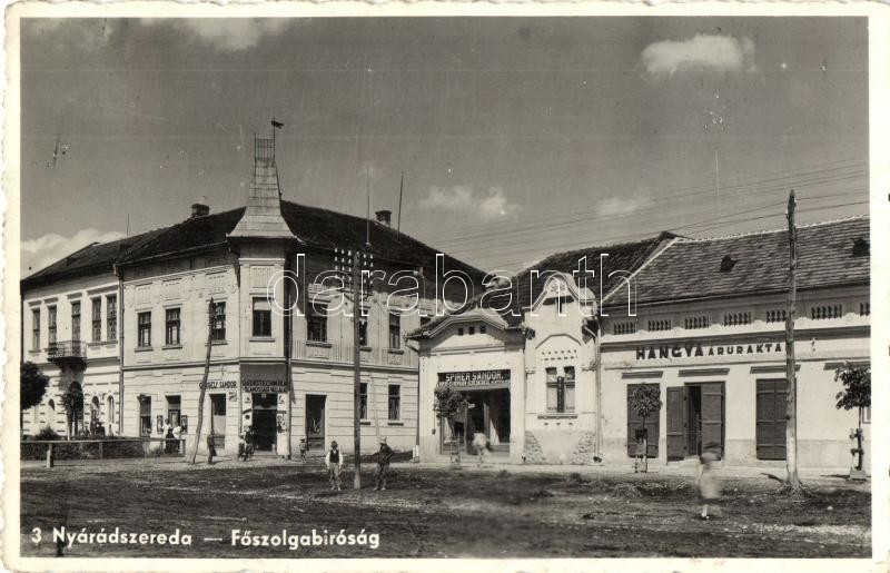 Nyárádszereda, Miercurea Nirajului; Főszolgabíróság, Hangya áruraktár, Spirer Sándor üzlete, Gergely Sándor radiotechnikai-villamossági vállalata / court, cooperative shop's depot, shops, electrical engingeering company (EK)