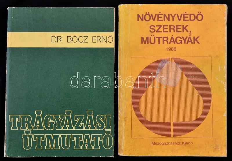 Vegyes könyvtétel, 4 db: A Magyar Népköztársaságban engedélyezett növényvédőszerek jegyzéke. 1969. Bp., 1969, Mezőgazdasági Minisztérium. Kiadói papírkötés, kopottas borítóval, intézményi bélyegzővel. Engedélyezett növényvédőszerek 1970. Bp., 1970, Mezőgazdasági Kiadó.Kiadói papírkötés, intézményi bélyegzővel. Dr. Bocz Ernő: Trágyázási útmutató. Bp., 1976, Mezőgazdasági Kiadó.Kiadói papírkötés. Növényvédő szerek, műtrágyák. 1988. Bp., 1988, Mezőgazdasági. Kiadói papírkötés, kopottas borítóval, foltos.