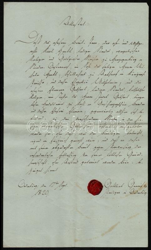 1829 Gamauf Teofil (1772-1841) evangélikus lelkész igazolólevele házassági ügyben, német nyelven, rányomott viaszpecséttel