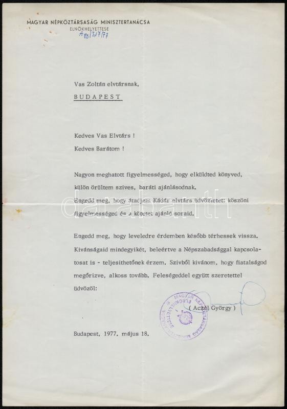 1977 Aczél György (1917-1991) kommunista politikus saját kézzel aláírt... https://www.darabanth.com/en/309-Online-auction/309.0/Other-collectibles/Historical-documents-manuscripts~17/1977-Aczel-Gyorgy-1917-1991-kommunista-politikus-sajat-kezzel-alairt-levele-Vas-Zoltan-190~II1659640