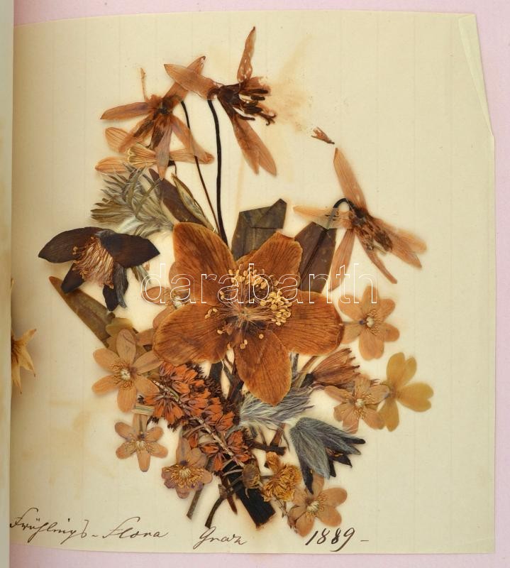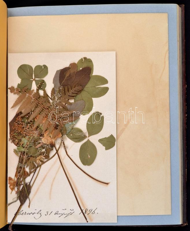 cca 1870 Dombornyomott egészbÅ‘r kötéses emlékkönyv. Teljesen kitöltetlenül, benne néhány az 1870-1890-es években gyűjtött növénnyel, hozzájuk kis lapokon Ãrt feljegyzésekkel. Szép állapotban