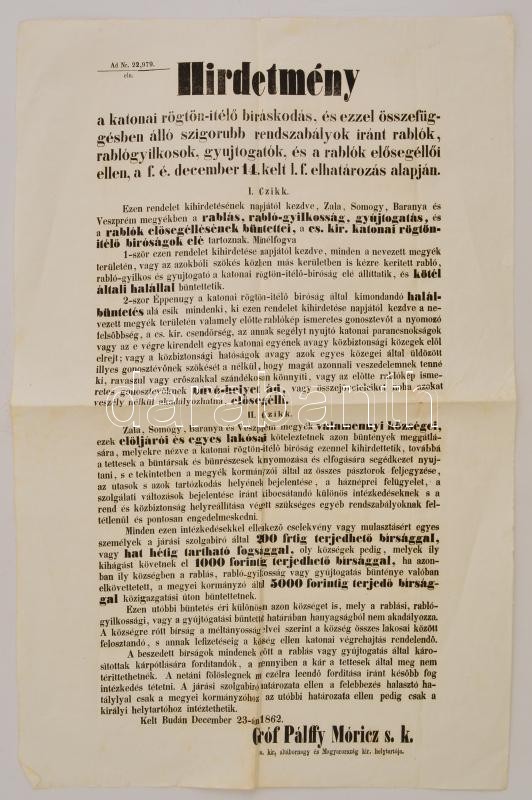 1862 Dunántúli megyékben bevezetett statáriumról szóló hirdetmény 33x54 cm