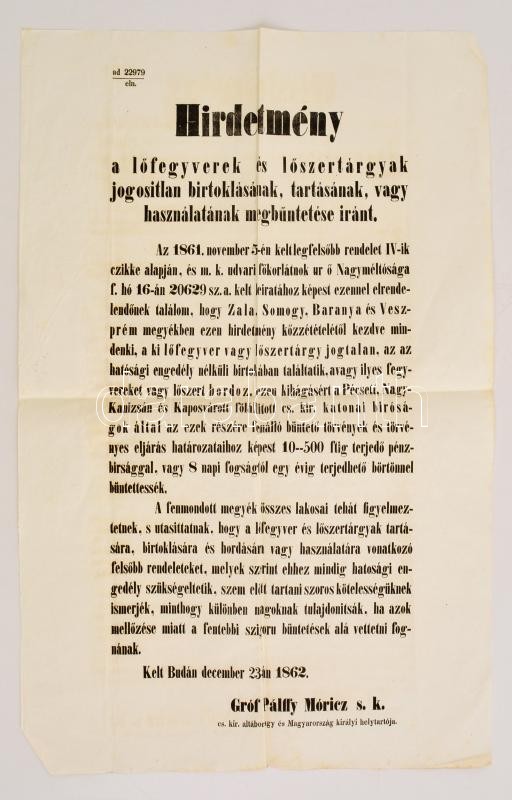 1862 Lőfegyverek birtoklását megtiltó hirdetmény 33x54 cm