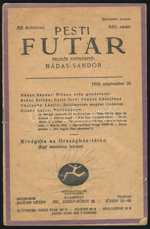 1919 a Pesti futár 12. évf. 585. száma (szept. 26.), számos érdekes aktuális írással