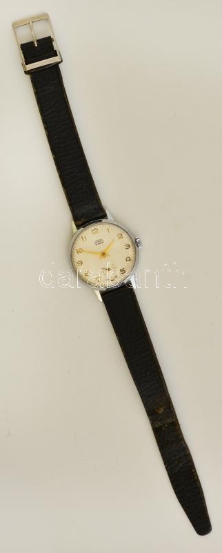 Prim 15 köves mechanikus karóra, bőr szíjjal, működő állapotban.d: 3 cm